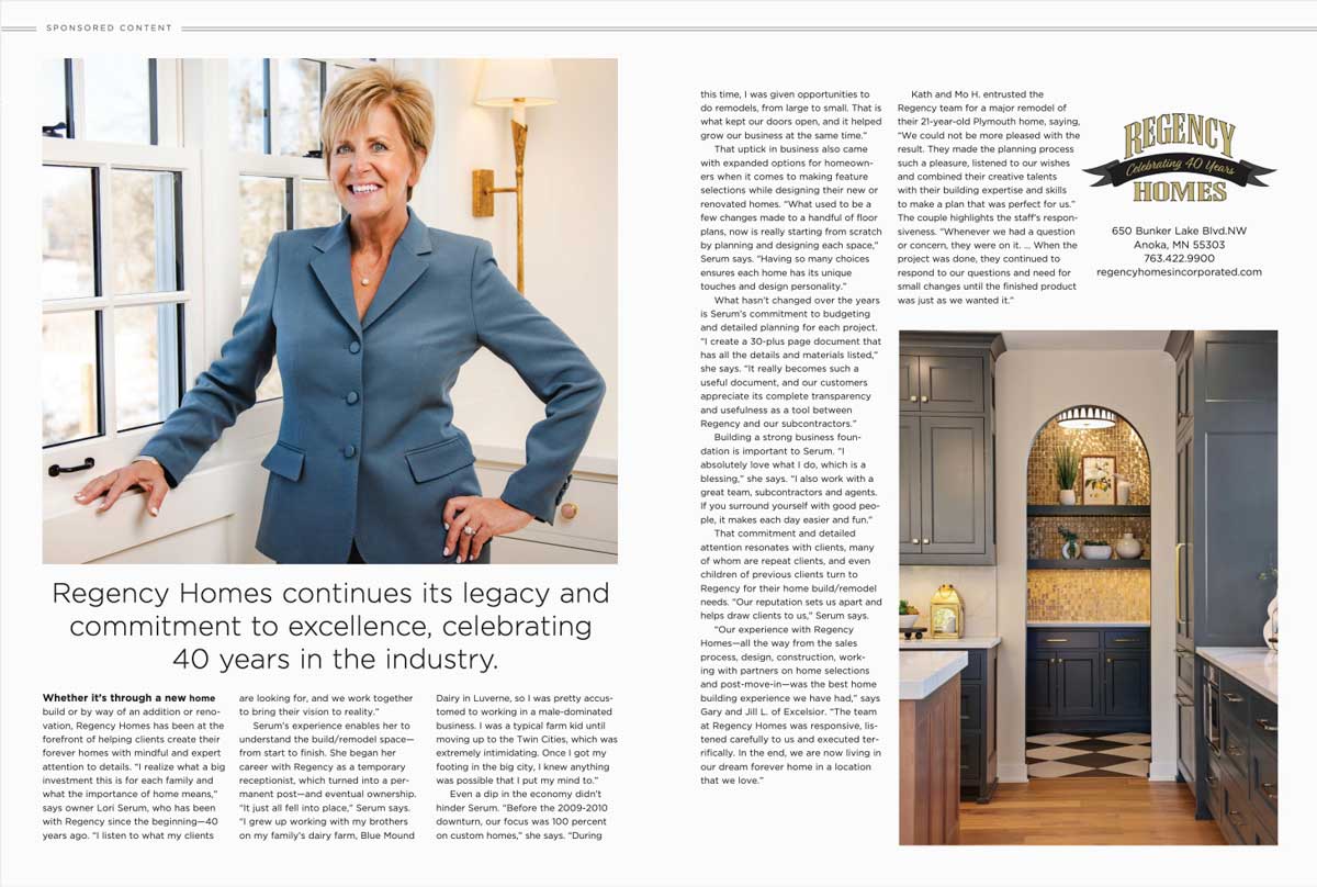 These efforts are led by industry experts Beth Ulrich, owner of Ulrich Real Estate, and Lori Serum, owner of Regency Homes. Together, Beth and Lori have over 50 years of experience building and selling homes in the Twin Cities area.